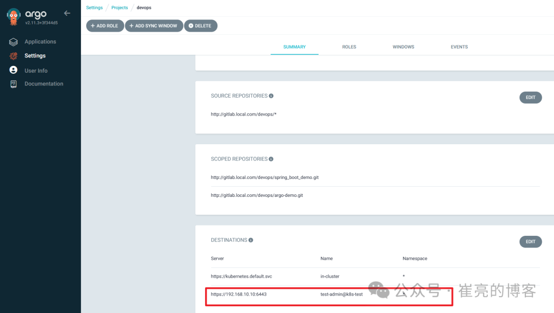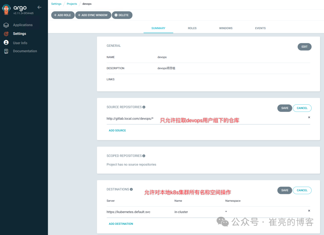 创建project,具体可参考文档:ArgoCD project-崔亮的博客 (cuiliangblog.cn),project配置如下: