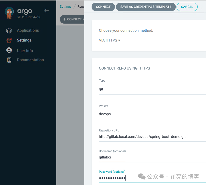 创建repo,具体可参考文档:ArgoCD快速体验-崔亮的博客 (cuiliangblog.cn),repo配置如下: