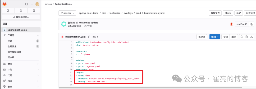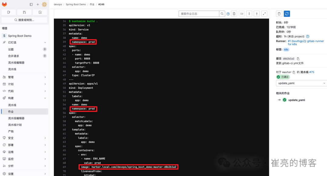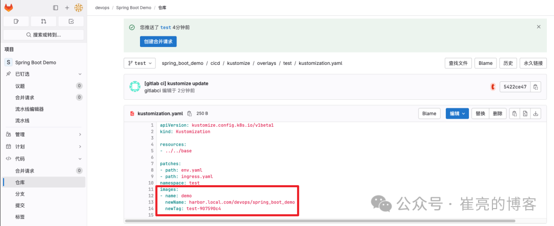 该job的主要内容是通过kustomize工具,根据不同的分支提交事件,生成不同环境的资源清单,并将镜像替换为最新的镜像地址,并将资源清单文件提交至Gitlab仓库。