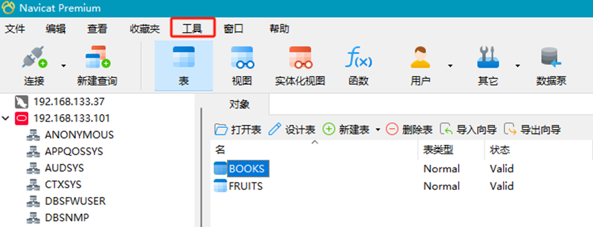 navicat连接oracle与mysql,点击"工具"选项,选择"数据传输"选项.