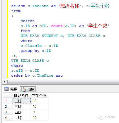 1、统计每个班的学生个数,输出“班级名称”、“学生个数”两项,按班级名称排序