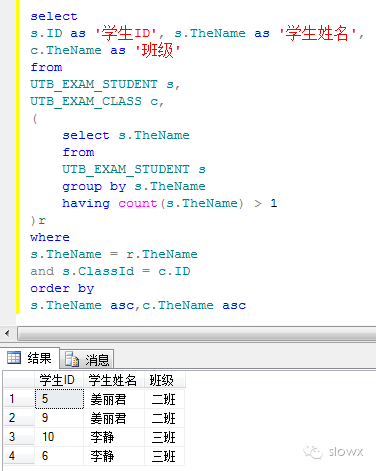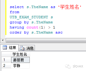 2、找出同名的学生,输出学生姓名