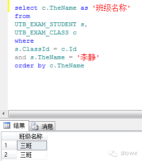 4、列出同名学生的姓名及其所在班级,按学生姓名排序,输出“学生姓名”、“班级”