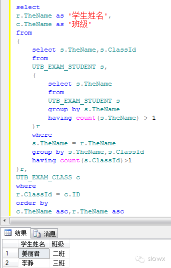 5、列出同名又在同一个班级的学生姓名及班级,输出“学生姓名”、“班级”,按班级名称排序