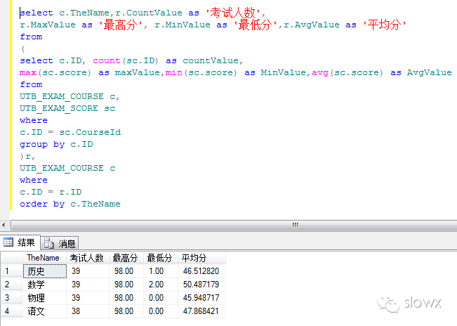 6、获得每个科目的名称,考试人数,最高分,最低分和平均分