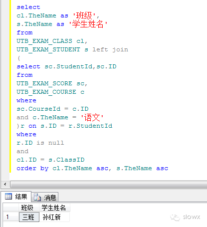 7、获得缺考“语文”科目(UTB_EXAM_SCORE没有对应记录)的学生信息,输出班级、学生姓名
