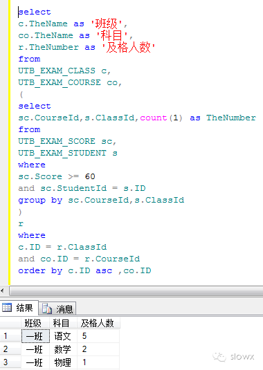 10、统计每个班每个科目的及格人数