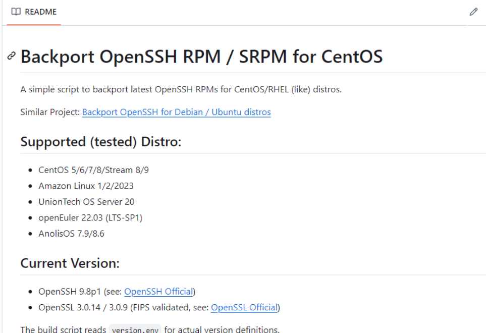 Centos环境离线编译升级太复杂,能不能使用类似欧拉的rpm包升级的方式修复,如果需要编译打包rpm包比直接编译升级复杂很多,虽然我可以自己打包一份放到网盘分享给大家,但是本着一劳永逸的想法, 在github中找到了一个项目,可以通过简单的docker脚本就可以实现各个版本的openssh rpm包构建。