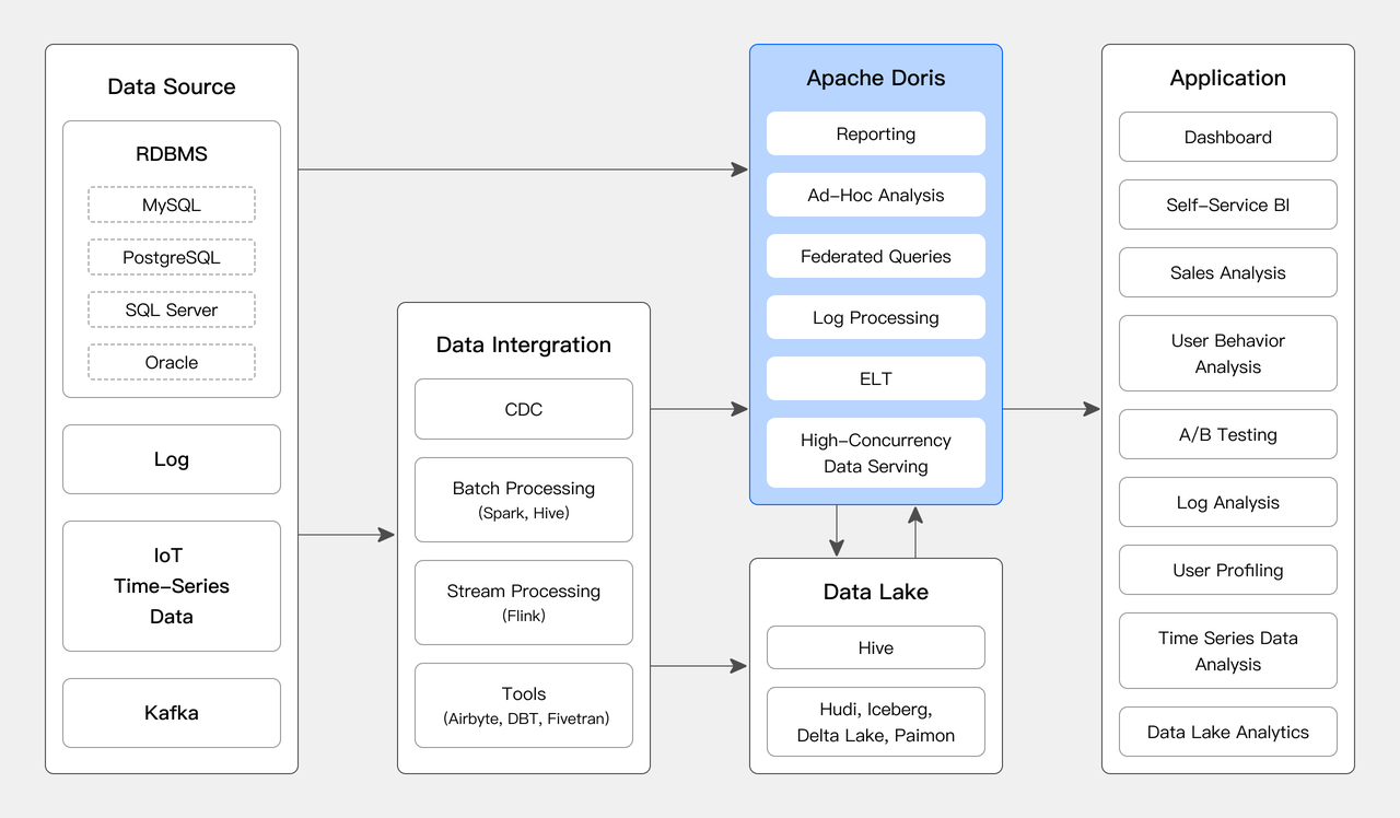混合型数仓通过实时数仓和离线数仓的协调合作,实现数据的分层处理和存储。通常的做法是将对实时性要求高的数据处理任务交给实时数仓,而对历史数据的批处理任务则交给离线数仓。例如:ApacheDoris属于一种能够支持实时数仓和离线数仓特性的混合型数仓。