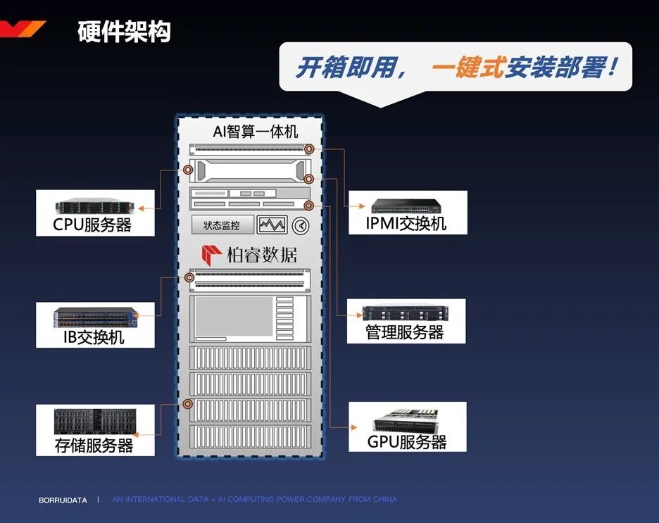面对新一轮科技革命和产业变革,人工智能已成为我国加快发展新质生产力的核心驱动力。今年来,大模型正在加速走向千行百业,催生各个行业走向深入的智能化转型。然而,大模型应用的规模化落地的首要挑战便在于AI智算基础设施的构筑,不是简单的服务器或GPU堆砌就可以解决问题,会受到硬件资源配置复杂性、模型管理难度和运营成本的制约。针对这一挑战,柏睿数据推出了AI智算一体机,精心重构计算、存储、网络以及数据服务等AI基础设施核心元素,集成了高性能计算主机和低代码AI建模软件,实现了一站式、可视化、开箱即用的AI基础设施解决方案。