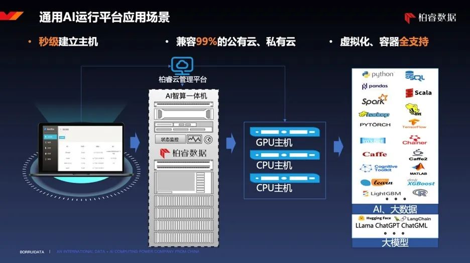 平台内部内置了丰富的技术与工具支持,涵盖从数据处理到模型训练的整个AI应用生命周期,包括Python,PyTorch,Spark,LangChain等等。通过通用AI运行平台的全面支持,AI智算一体机实现了对各类云服务、虚拟化与容器技术的兼容,构建了一个一体化的应用生态。这种生态提高了AI应用的部署与管理效率,也为企业提供了更大的灵活性和选择空间。