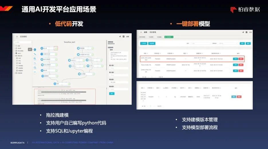 在软件层面,AI智算一体机内置了低代码AI建模软件,使得用户无需具备深厚的编程知识即可轻松构建和部署AI模型。该软件支持生成式AI、自然语言处理、计算机视觉、机器学习和深度学习等多种AI应用,并且与多种开源大模型兼容,如Llama、ChatGLM等,实现了模型的无缝集成与动态调度。