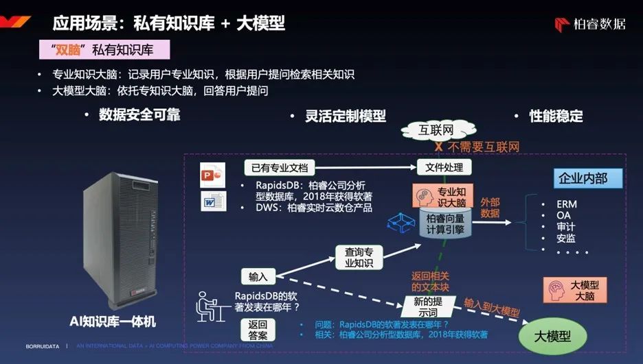 专业知识大脑记录并管理用户的专业知识,可以根据用户的提问快速检索相关知识。企业内部的专业文档、ERM、OA、审计和安监等数据都可以纳入其中,确保知识的安全性和可靠性。例如,当用户查询“RapidsDB的软著发表在哪年?”时,专业知识大脑能够迅速找到相关信息并提供准确的答案,如“柏睿公司分析型数据库,2018年获得软著”。