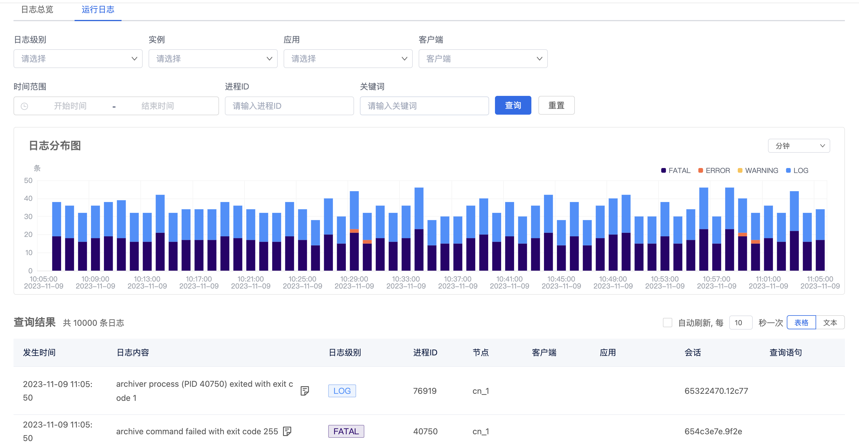 日志管理提供日志总览、错误日志、运行日志等数据查询能力。旨在帮助管理员有效地管理数据库的日志记录,确保数据的安全性、可用性和可追溯性。且允许管理员根据多种筛选条件来查询和分析数据库的日志数据。包括 FATAL、ERROR、WARNING 和 LOG 等级别。