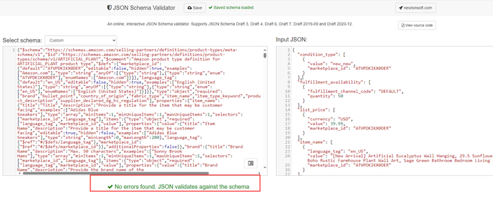 正常是提示【No errors found. JSON validates against the schema】,然后才能通告Listing正常提交,提交完成之后你会收到提交成功的提示,这并不意味着产品创建成功了,等待5-10分钟后通过get Listings Item 查看issues是否有异常提示。