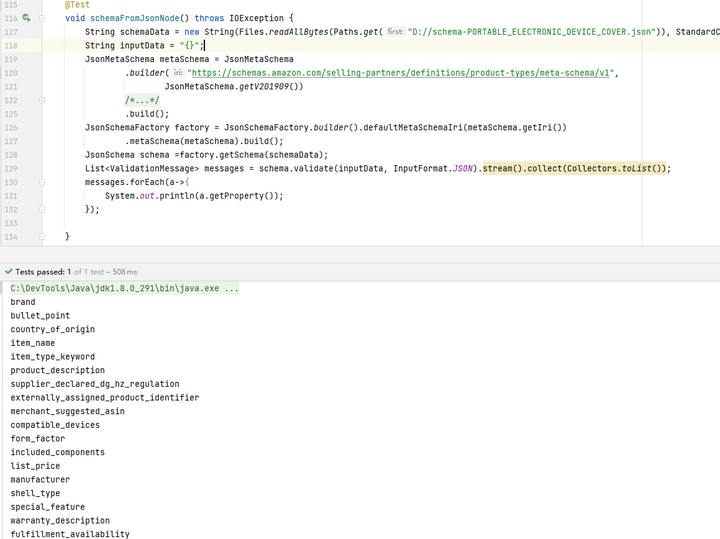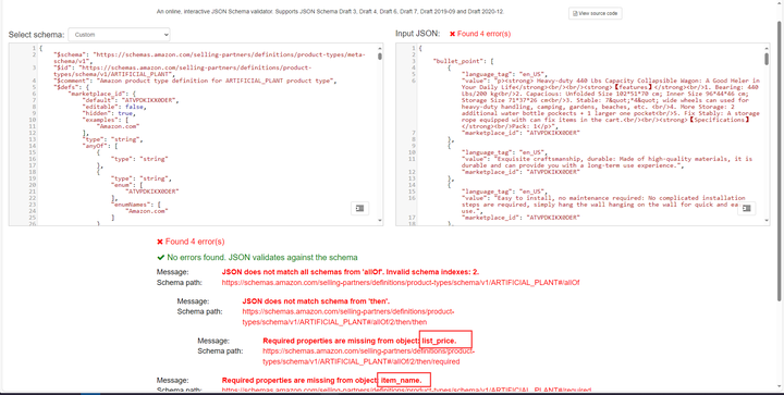 一开始的方向跑偏了,一直在后端捣鼓这些,想着把不同类目Schema的必填属性都获取到存下来,告诉前端哪些是必填的,这方面赛狐就是这样的,所以思路也是跟着这个在走,看着官方也给出了校验示例java networknt/json-schema-validator校验,NND就没有正常过,使用networknt/json-schema-validator 校验的时候,看报错会从官方schema.json文件里读取schema的url信息,然后这个地址( https://schemas.amazon.com/selling-partners/definitions/product-types/meta-schema/v1)文档说是不能读取的,这尼玛玩呢。官网给的示例也是没法用,可能也是我菜吧~~~有谁用官网示例schema校验调通了的请赐教。