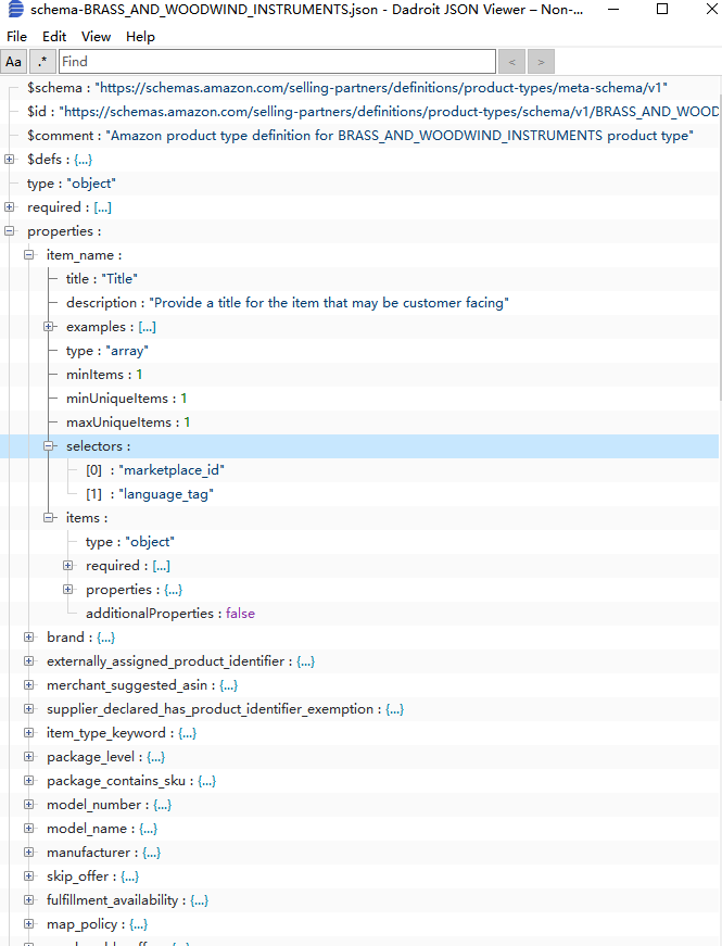 { //选择的类目 "productType": "LUGGAGE", "requirements": "LISTING", //以下是商品信息的属性结构,可以看到有两种情况的属性,一种是带 "language_tag": "en_US",一种又是不带的。 "attributes": { "condition_type": [ { "value": "new_new", "marketplace_id": "ATVPDKIKX0DER" } ], "item_name": [ { "value": "AmazonBasics 16\" Underseat Spinner Carry-On", "language_tag": "en_US", "marketplace_id": "ATVPDKIKX0DER" } ], ... } }