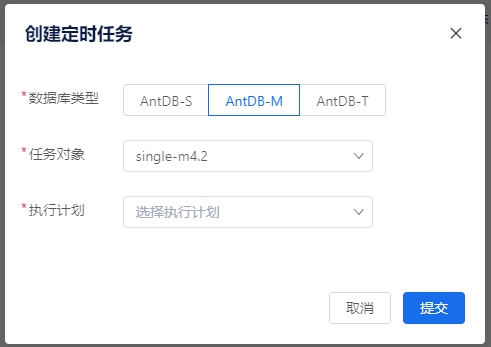 点击定时任务配置菜单,点击创建任务按钮,选择数据库类型、任务对象、执行计划后,点击提交,创建完成一个定时任务,并且会立即执行一次。