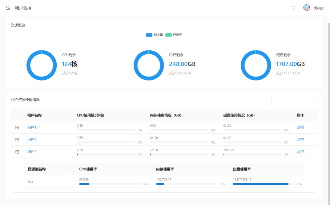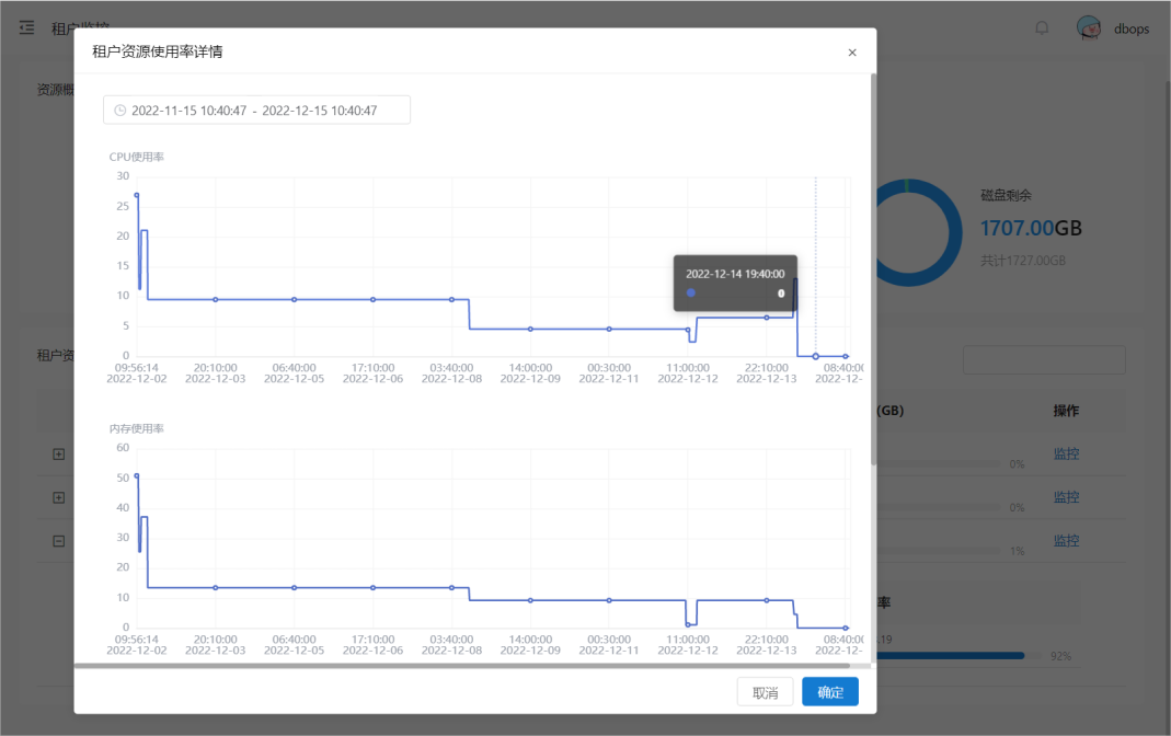 资源概览下方展示租户资源使用情况,包含所有租户的CPU、内存和磁盘的分配总量与使用量。 租户维度:计算了分配到租户上的资源总数与使用情况。点击操作列的监控按钮,可以查看租户资源使用率的时间趋势图。趋势图代表的是该租户下的资源分配变化情况。