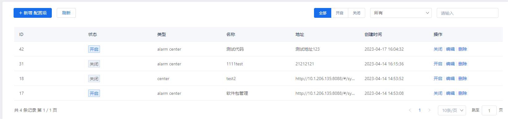 点击新增配置项,输入名称,类型、接口地址和状态后开启配置项。