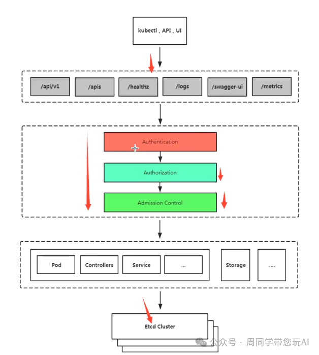 kubectl, API, UI:这些是访问K8s API Server的工具。 /api/v1, apis, healthz, logs, swagger-ui, metrics:API Server提供的不同接口。 Authentication, Authorization, Admission Control:三个主要安全控制阶段。 Pod, Controllers, Service, Storage:实际的K8s资源。 Etcd Cluster:K8s的后台存储,用于持久化集群状态。