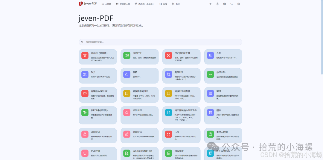 Stirling-PDF 是一个现代化的开源 PDF 处理工具,它提供了一套丰富的功能,可以通过 API 接口轻松地操作 PDF 文档。以下是 Stirling-PDF 的主要功能的详细介绍: