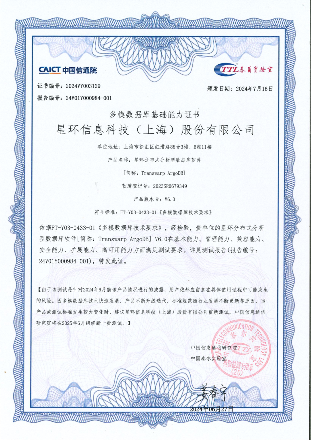 在中国信通院组织的首批“可信数据库”多模数据库产品测试中,星环科技分布式分析型数据库ArgoDB首家通过多模数据库产品基础能力测试。测试过程依据标准在基本功能、运维管理、安全性、兼容性、扩展性以及高可用六大能力域的相关要求。测试结果表明,ArgoDB在多模数据库的功能完备性、易用性、通用性等方面均符合标准要求。