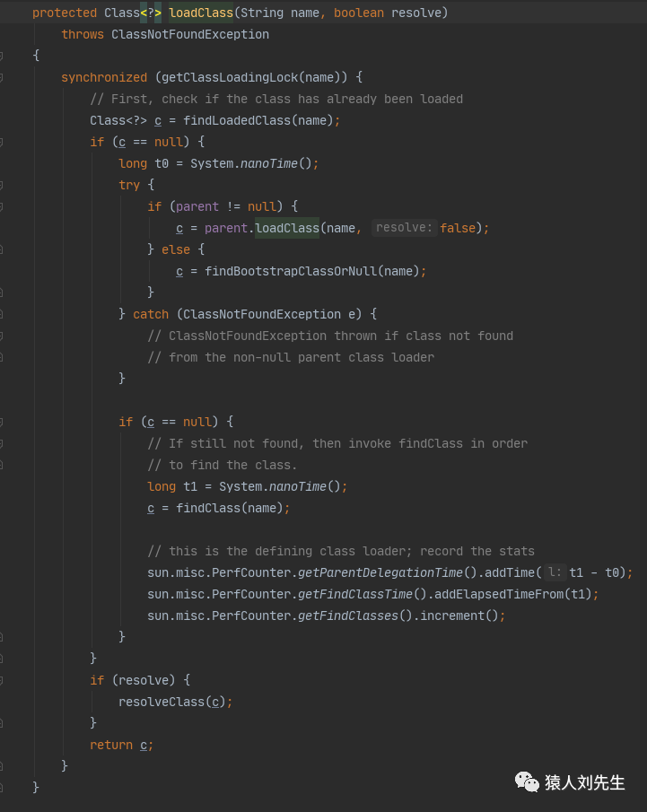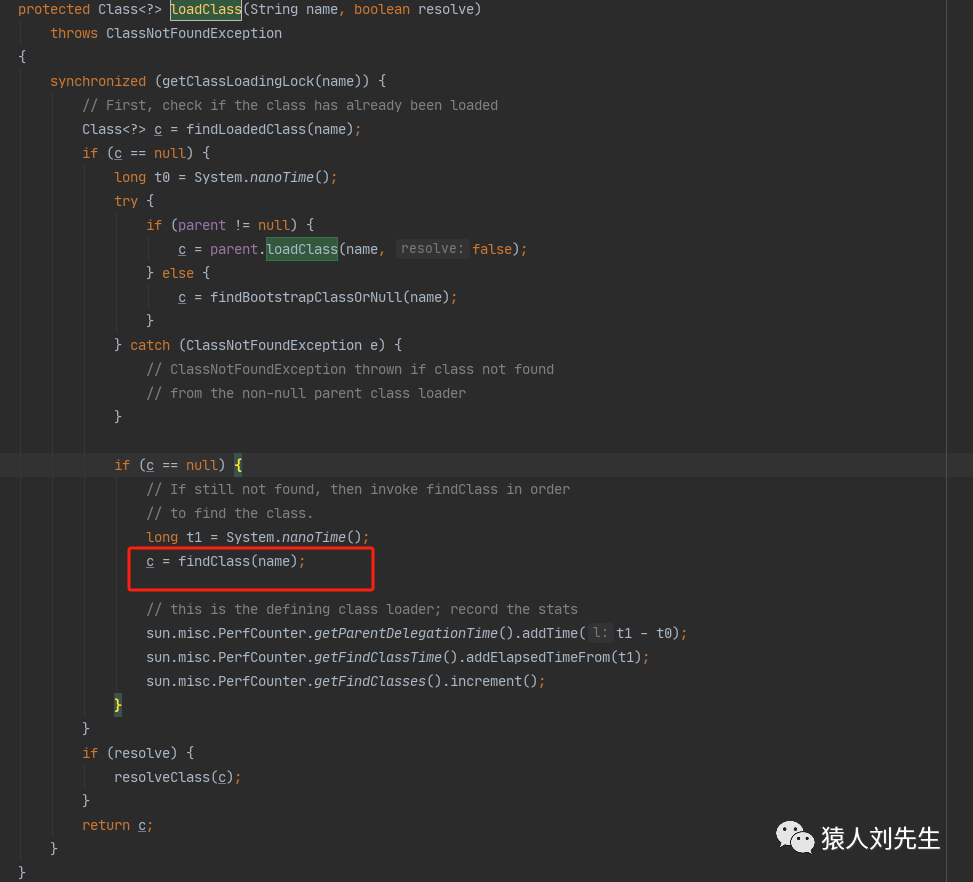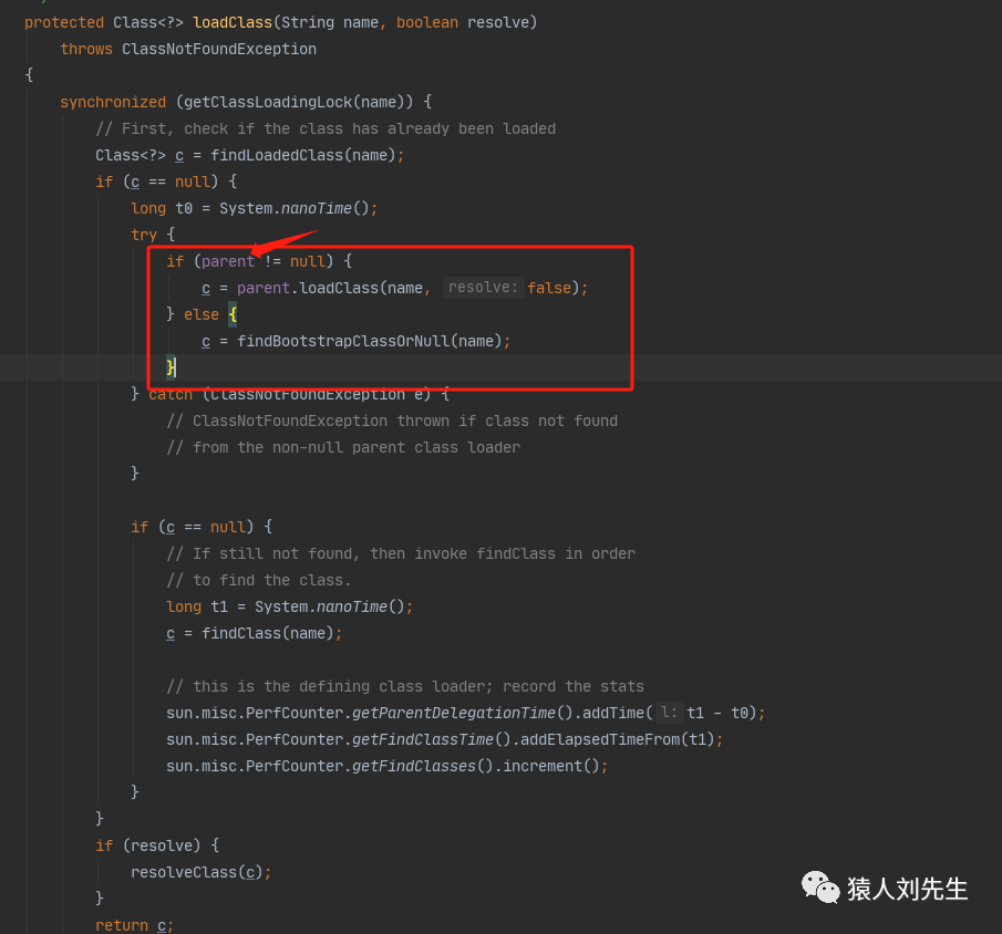 来看下应用程序类加载器AppClassLoader加载类的双亲委派机制源码,AppClassLoader 的loadClass方法最终会调用其父类ClassLoader的loadClass方法,对应的就是下图我圈住的地方,该方法的大体逻辑如下: