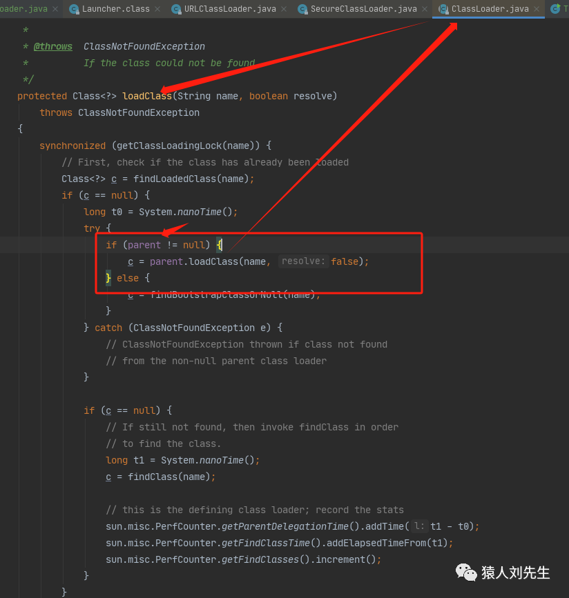 这个时候,parent是不为空的,这个parent就是扩展类加载器,执行parent.loadClass()又会调用到ClassLoader的loadClass方法,就是又会进来当前这个方法(可以debug去看,这里就不详细展示了)