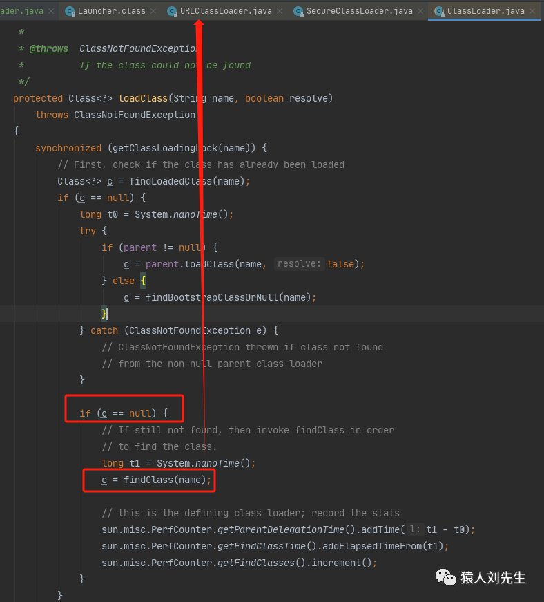 c==null是肯定的,因为引导类加载器没有加载到,然后会调用扩展类加载器的findClass方法,这个findClass方法是扩展类加载器继承的URLClassLoader的findClass方法,也就是执行的是URLClassLoader的findClass方法,但是当前的类加载器是扩展类加载器