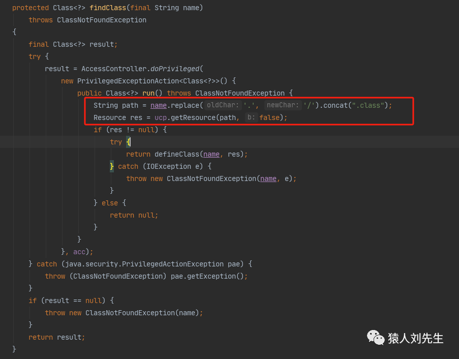 这行代码主要就是生成了一个path,比如name是com.liuxs.jvm.Math,然后替换之后是com/liuxs/jvm/Math.class,然后ucp.getResource去target下面根据这个path找对应的class文件装载到jvm内存中,装载的过程就是defineClass方法