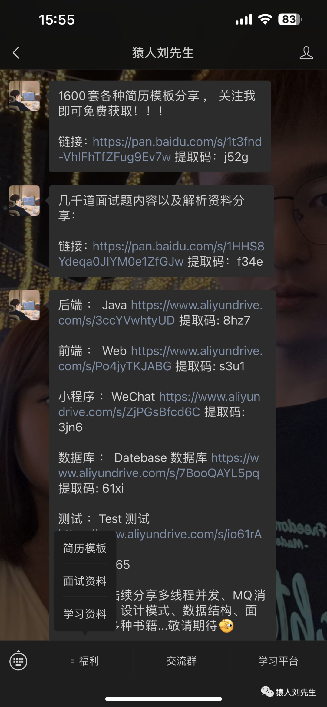 同时也希望您用发财的手帮忙点个关注,可以通过下方菜单点击福利领取上千套简历模板、几千道的面试题pdf以及几百G涵盖了Java开发,前端开发,小程序开发,数据库,测试等等的相关学习书籍与资料。