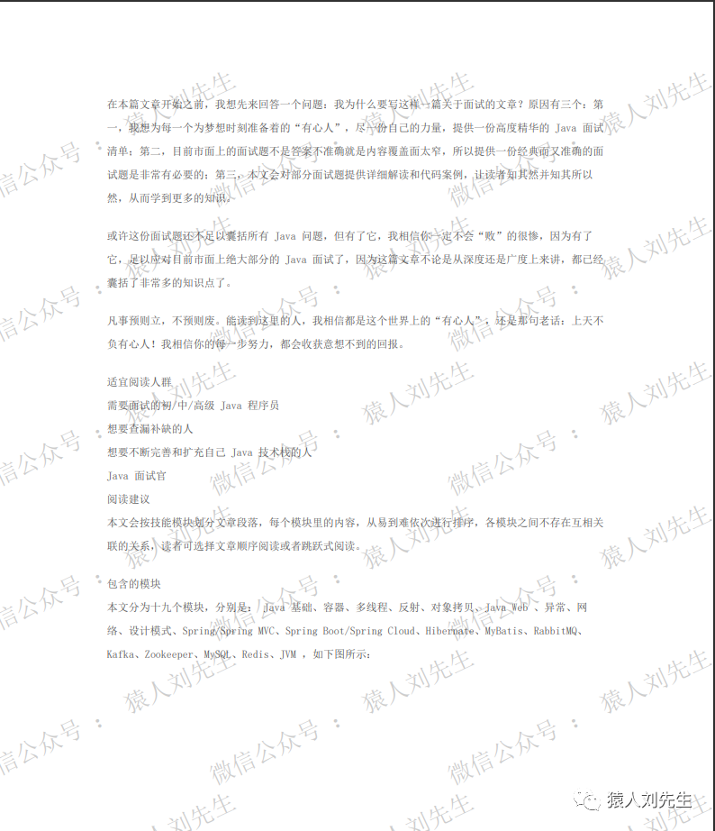 public static void main(String[] args) {// 获取指定路径的pdfFile file = new File("E:\\学习\\面试题\\面试题分享");for (File listFile : file.listFiles()) {if(listFile.getName().endsWith(".pdf")){try {System.out.println(listFile.getName());addPDFWaterMark("E:\\学习\\面试题\\面试题分享\\" + listFile.getName() , "E:\\学习\\面试题\\面试题分享-水印\\" + listFile.getName() , "微信公众号 :猿人刘先生");} catch (Exception e) {e.printStackTrace();}}}}}