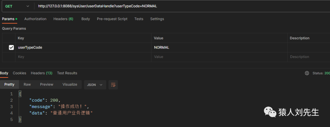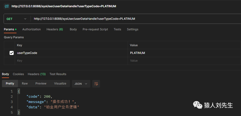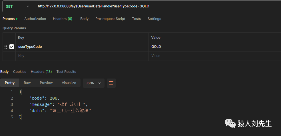 @RestController@RequestMapping("sysUser")public class UserDataController {@Resourceprivate StrategyTypeFactory strategyTypeFactory;@RequestMapping("userDataHandle")public Result<Object> userDataHandle(String userTypeCode){// 根据不同的用户类型执行不同的策略UserDataHandler userDataHandler = strategyTypeFactory.getUserDataHandler(StrategyTypeEnum.USER_STRATEGY_TYPE.getStrategyTypeCode() + ":" + userTypeCode);if(userDataHandler == null){return Result.error(HttpStatusCodeEnum.ERROR);}return Result.success(userDataHandler.handleUserData());}}