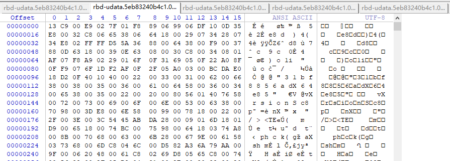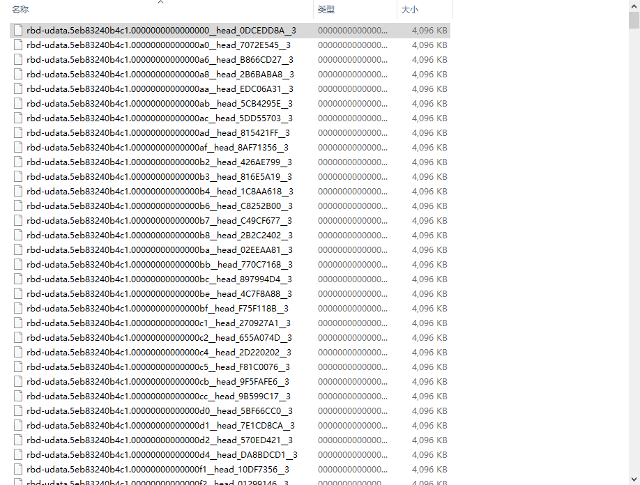 为了找回丢失的数据,针对ceph分布式的文件存储方式,我们手动将服务器硬盘中的文件全部提取出来。再分析文件的命名方式,解析出文件磁盘卷的组合方式,在同一组文件磁盘卷中文件的命名都存在同一ID(例如5eB83240b4c1);将所有文件将同一组文件磁盘卷的文件归类到统一文件夹并做好命名标记。继续分析标记文件夹中文件,在文件磁盘卷名称ID后存在文件排列顺序ID(例如0000000000000000),将标记文件夹文件以顺序ID排序发现文件顺序ID并不连续;通过解析文件顺序ID之间相互的数据结构,确定文件顺序ID丢失部分为文件磁盘卷中全为零的文件块,手动将文件磁盘卷组合完成。对组合完成的文件磁盘卷检验是否完整,若有错误则继续上一步操作,若无错误则手动提取恢复的数据。