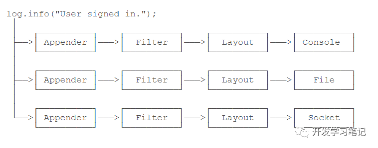 当我们使用Log4j输出一条日志时,Log4j自动通过不同的Appender把同一条日志输出到不同的目的地。例如: