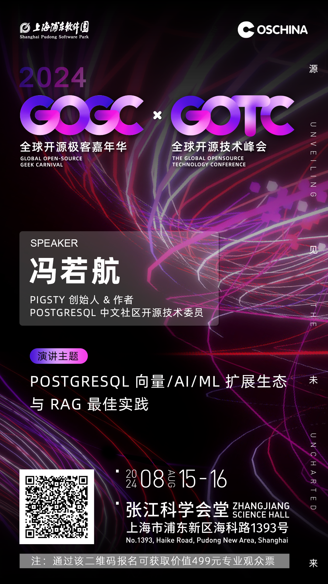 我会在 8月16日上午的《开源数据库与AI协同创新》专场,进行一个题为 《PostgreSQL 向量/AI/ML扩展生态与RAG最佳实践》的分享,聊一聊最适合 AI 时代的数据库 —— PostgreSQL。