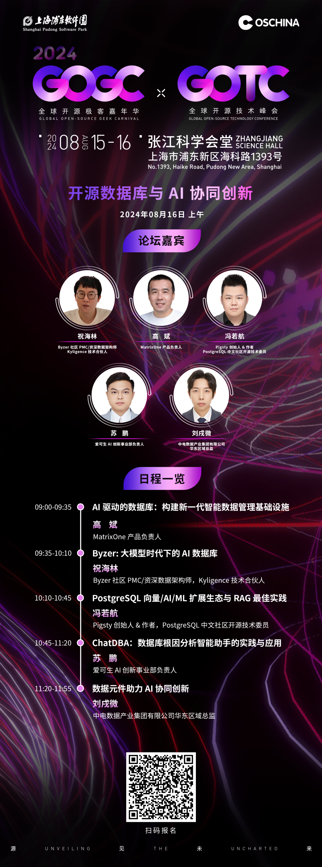 2024 年 8 月 15 日至 16 日,2024 全球开源技术峰会 GOTC x GOGC 全球开源极客嘉年华将于上海张江科学会堂 举行。大会将以主题演讲、创新集市、黑客松、互动工作坊等形式,聚焦 AI、数据库、云原生等技术领域。