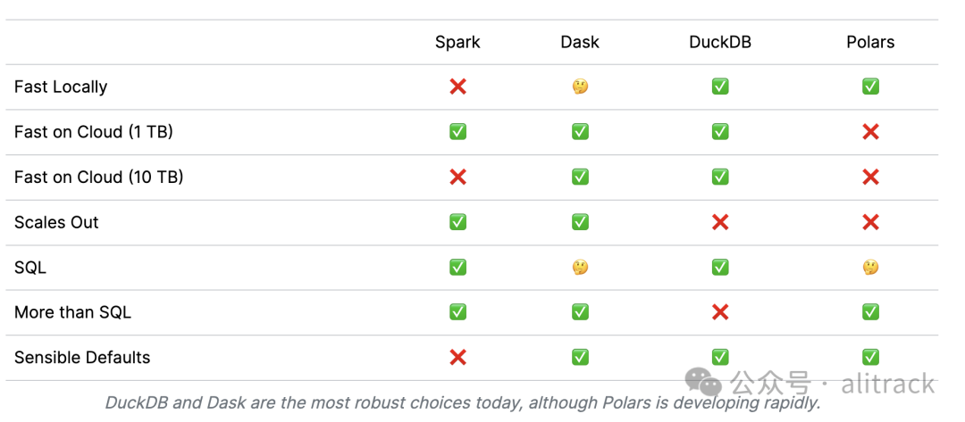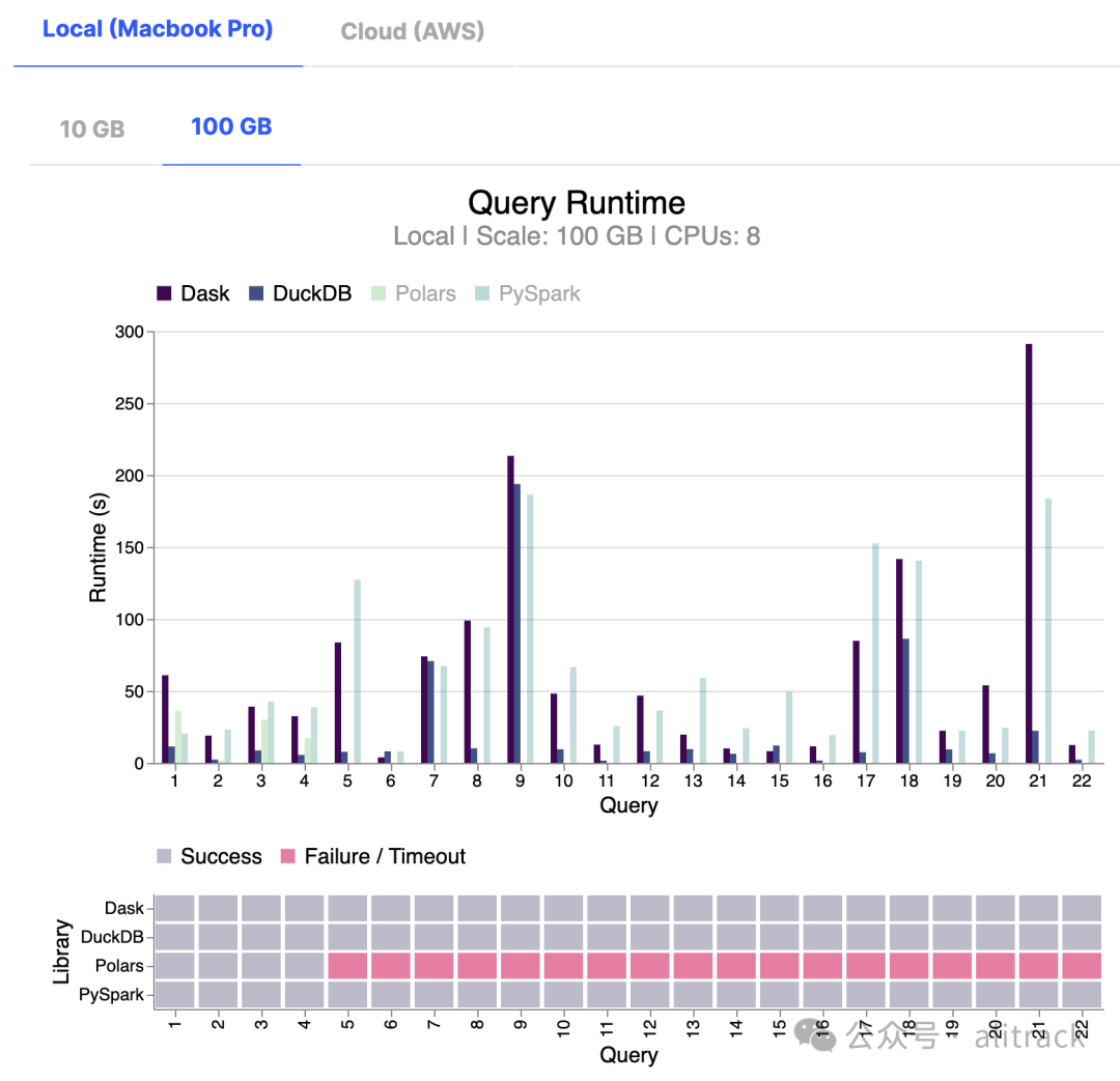 选择 Dask 或 DuckDB。对于更大的数据,Polars 尚未完全稳定。不过,Polars 正在快速改进,并且是这个组中最动态的项目。DuckDB 更可靠(Dask 也是,但速度慢)。Spark 在这里很容易失败。如果你想对 100GB 本地数据执行 SQL 查询,DuckDB 是明智的选择。