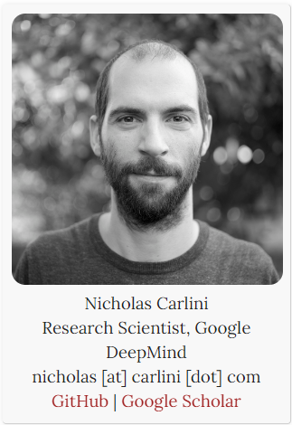 Nicholas Carlini 是Google DeepMind的研究科学家(此前在Google Brain),专注于机器学习与计算机安全的交叉领域研究。