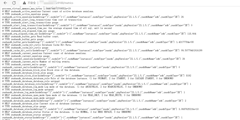 2.然后编辑数据库实例配置文件,设置好数据库地址等信息。接着在9100端口启动YashanDB Exporter,此时访问Metrics接口已经可以看到采集到的数据库信息: