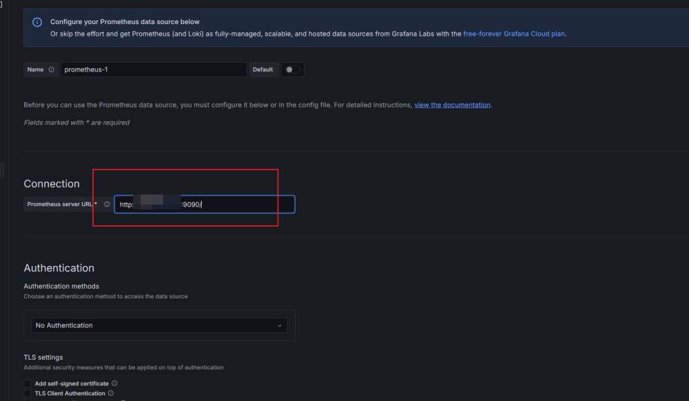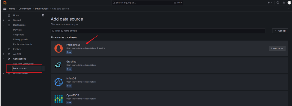 7.配置Grafana Server的数据源,选择Prometheus。根据我们前面的配置,其在9090端口运行: