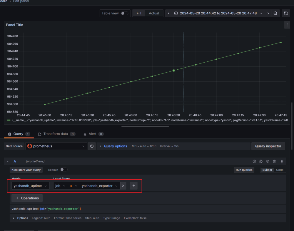 8.添加Dashboard,以监控数据库实例的启动时间(yashandb_uptime)为例: