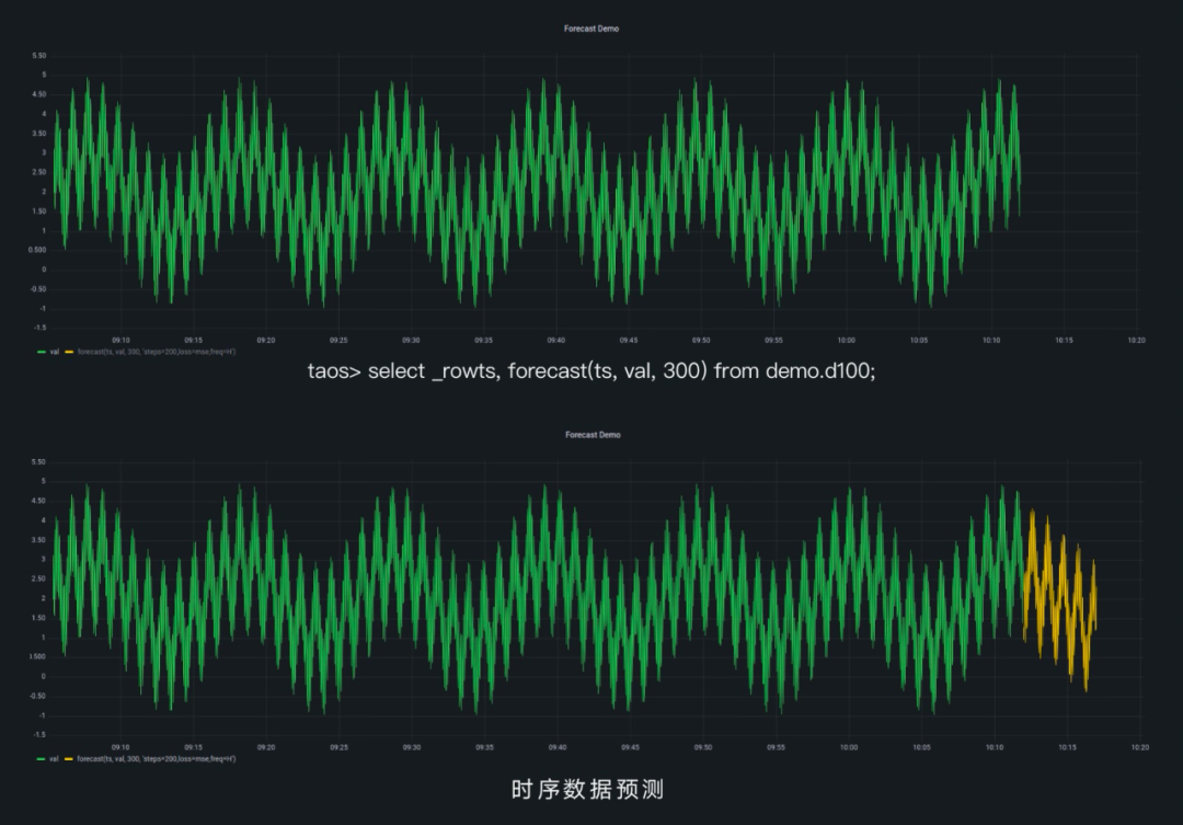 十年前,移动互联网浪潮之后,2012 年,Hinton 的关于 ImageNet 分类的论文发表,2016 年 AlphaGo 战胜围棋名将李世石,标志着人类正式进入 AI 时代。如今,人脸识别无处不在,各种图像处理工具不再是设计师的专利。本来,AI 的热潮似乎已经降温,但谷歌在 2017 年发表的一篇标志性论文再次将 AI 推向高潮。2022 年 11 月,ChatGPT 问世,其生成式 AI 的惊艳表现让全球陷入了 AI 的狂热之中。现在,大家都可以用 AI 生成文字、报告、图片、视频,甚至是代码和考试题。大家也可以用 ChatGPT 来写 TDengine SQL 语句,会有意想不到的结果。就在本周三(2024 年 7 月 24 日),Meta 又宣布推出 405B 的 Llama 3.1,使开源的 LLM 各项指标紧逼甚至超过了闭源的 GPT-4。这真是一个令人激动的时代,AI 的浪潮势不可挡。我们在座的各位,来自智能制造、石油、石化、钢铁、电力、新能源、汽车等行业,都是 IT 从业者。我相信大家都已经感受到 AI 的这股浪潮,一个典型的问题便是:“我能做什么?”大家心中难免忐忑:我这个年龄,还能学会 AI 吗?我的工作是否会被 AI 取代?我如何将 AI 技术应用到我的工作中去?今天,我将展示一个 Demo。这是一个震动传感器采集的数据,随着时间的推移,不断有新的数据点产生。现在 AI 大语言模型能够生成文字和视频,那它能否根据历史数据预测未来的数据?现在,请大家见证一个奇迹。在TDengine 中,执行如下 SQL 语句:taos> select _rowts, forecast(ts, val, 300) from demo.d100;