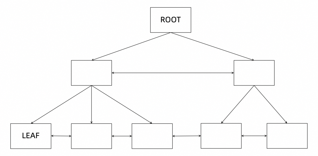 最上层的为根节点(ROOT),每个 B+tree 都只会有一个根节点; 最下层的为叶子节点(LEAF),叶子节点也是实际保存数据的节点; 中间层为非叶子节点(根节点也其实也是非叶子节点),保存索引数据,根据 B+tree 本身的大小,可能有 0 到多个中间层。
