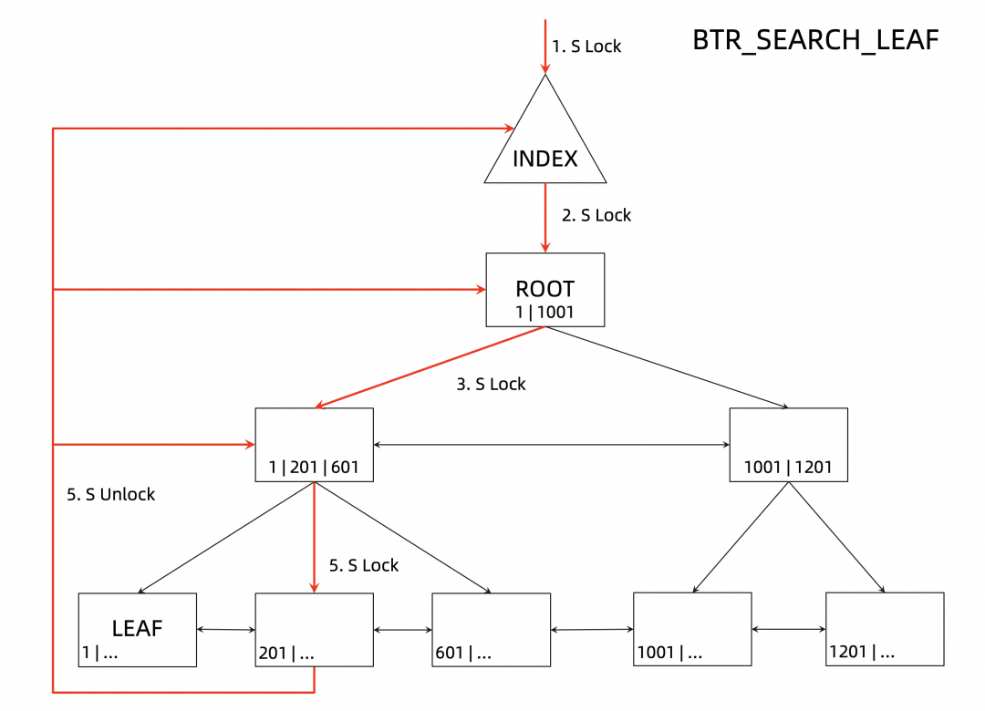 事实上,B+tree 的加锁过程其实也是按照上述访问路径进行的。还是以上述的查询为例,B+tree 上加锁的过程如下图所示: