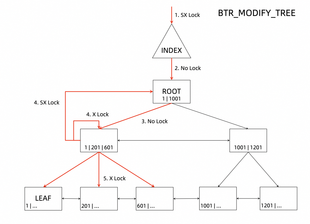 页级别的并发访问控制发生在 B+tree 的遍历过程,也就是 B+tree 的加锁过程; 加锁的对象包括了 index 和 page; 加锁的类型包括了 S,SX 和 X,其中 S 锁和 SX 锁不互斥; 查询过程只加 S 锁; 修改过程,根据修改的类型加锁过程有所区别。如果是页内的数据修改,走乐观更新的逻辑,只有被修改的叶子节点加 X 锁;如果是悲观更新的逻辑,index 和根节点要加 SX 锁,索引可能被修改的节点都要加 X 锁。