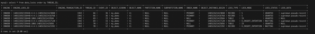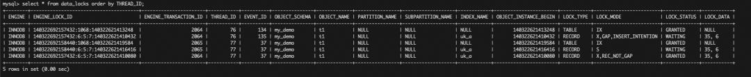 通过 data_locks 表中的锁等待关系发现,session 2(THREAD_ID = 69)和 session 3(THREAD_ID = 70)都在等待意向锁,隐含的语义是都持有了 Gap 锁,所以造成了死锁。