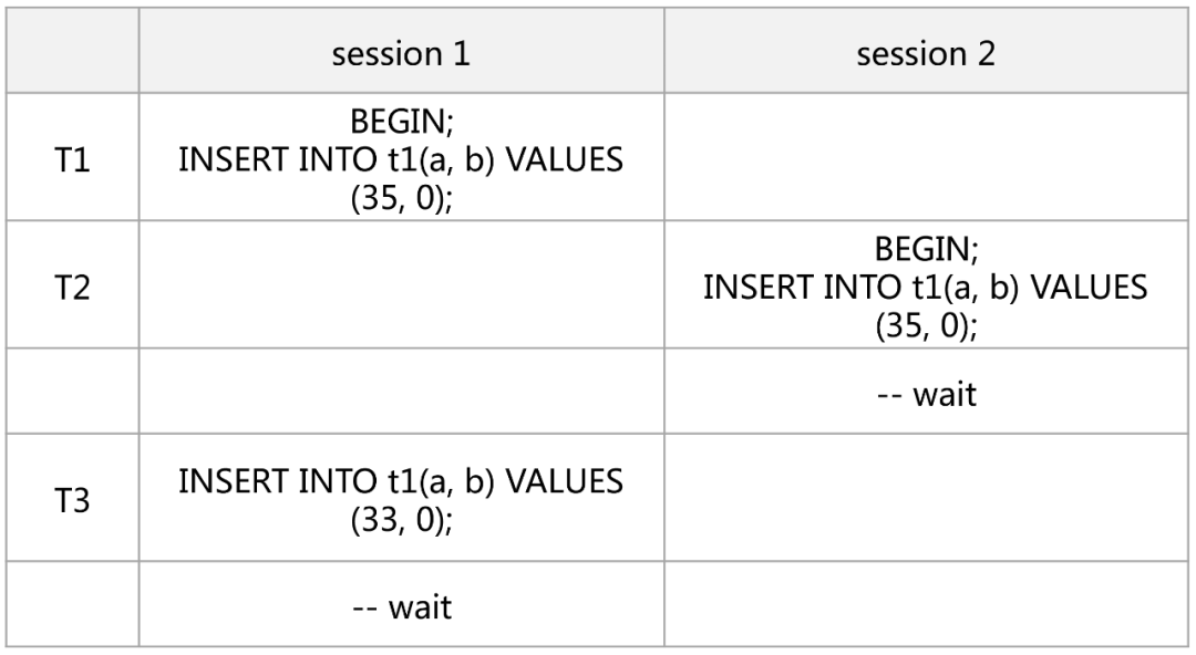 发现记录已经存在,并且对应的事务是一个活跃事务,这个时候会触发隐式锁转显示锁的逻辑,简单来说就是 session 2 为 session 1(准确的说是 trx 1)创建一个 Rec X Lock,因为这个时候还不存在任何等到关系,所以可以直接获取到锁; 继续为自己创建一个 Rec S Lock,由于和前面的 Rec X Lock 冲突,所以会加入到等待队列,跳过后续的插入操作,最后进入到lock_wait_suspend_thread函数中进行等待;