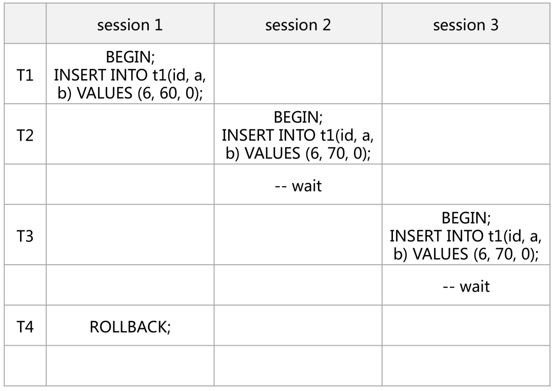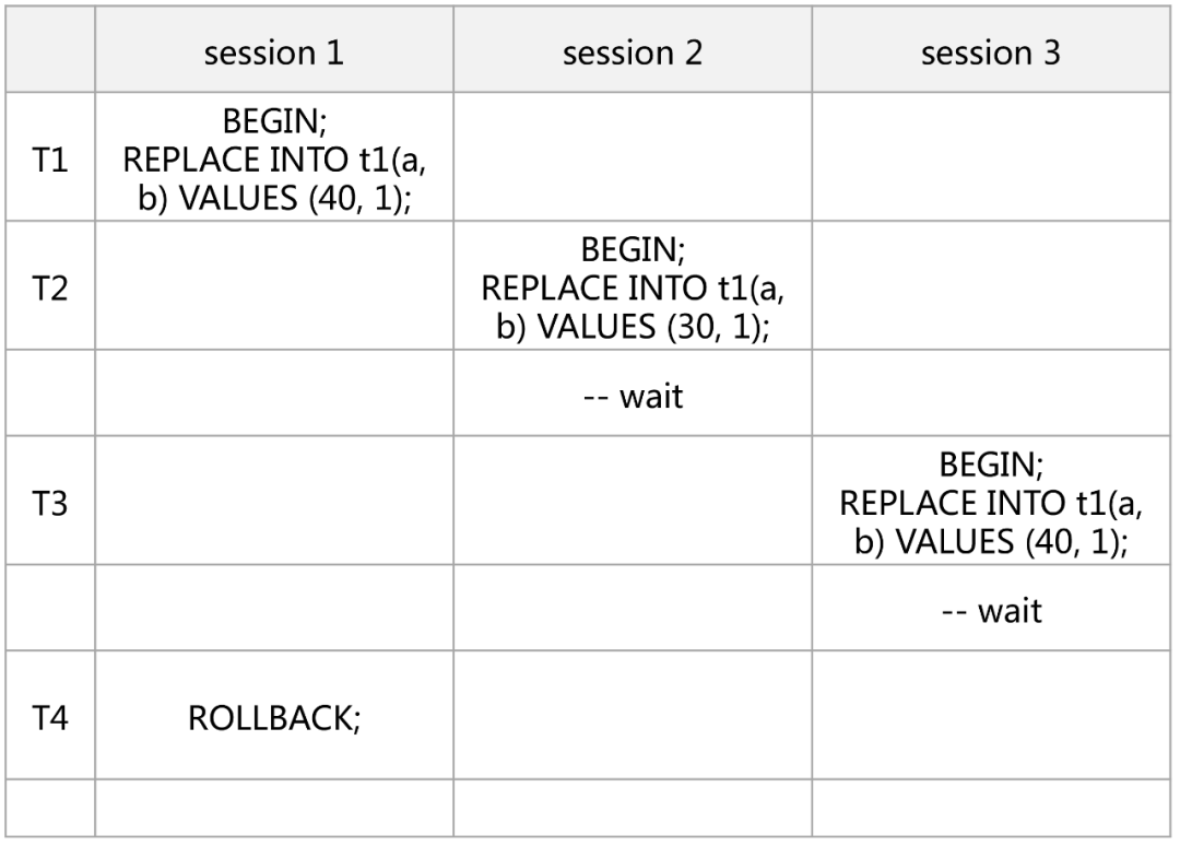 session 1 在回滚的时候,并不是简单的释放 Rec X Lock,然后唤醒 session 2 和 session 3; session 1 的回滚逻辑里面有一个非常重要的步骤lock_rec_inherit_to_gap,该函数会把 session 2 和 session 3 上的 Rec Lock 转换为 Gap Lock; session 2 和 session 3 被唤醒后,不论是哪个线程先进入到插入逻辑,都会在插入前的锁冲突检查中(lock_rec_insert_check_and_lock)发现对方的 Gap 锁,然后生成插入意向锁。
